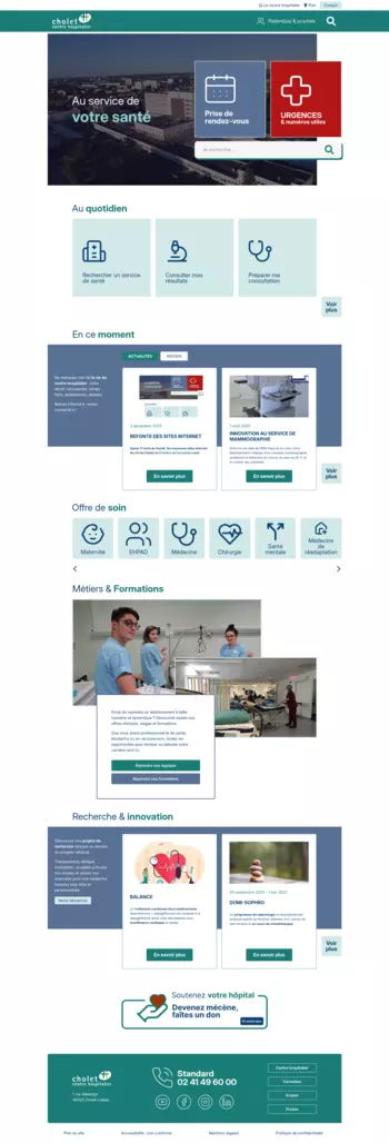 L’ancienne version, conçue en 2017 sous WordPress, ne répondait plus aux usages actuels ni aux attentes du public. Cette refonte a offert l’opportunité de repenser entièrement le portail numérique de l’établissement afin de placer l’expérience utilisateur au cœur de sa stratégie digitale. La migration vers Drupal marque un véritable saut technologique. Ce CMS, reconnu pour sa robustesse, offre une architecture plus sécurisée et pensée pour évoluer, un contrôle fin des accès et des droits utilisateurs, ainsi qu’une meilleure capacité à gérer des volumes importants d’informations — un atout essentiel pour un établissement hospitalier. Cette nouvelle architecture a par ailleurs servi de base commune pour la réalisation du site de l’IFPS de Cholet. Cela a permis d’harmoniser les outils, de mutualiser les développements et de proposer une expérience utilisateur cohérente entre le site du CH et celui de son institut de formation.